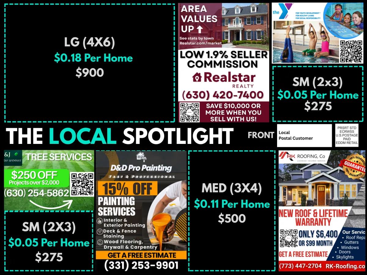 Local businesses can now showcase their brand on a large 9"x12" postcard sent straight to roughly 5,000 homes in the community, which can be 10,000 or more customers (2 people per household).